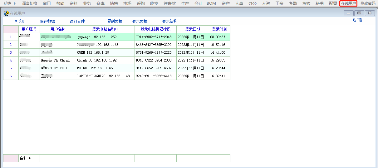 孟老师有更新了【get_online_user()】函数可以用来查看在线用户,在【主窗口脚本定义】脚本添加【menu_add_csp("MainMenu",24,'xxxxxx','在线用户','在线用户');】创建在线用户菜单 新建一个【在线用户】脚本文件【或导入附件脚本文件后根据实际情况修改】,提取当前在线用户账号来查询在线用户最后的登录信息,在此感谢【十二个耳环】老师的在线用户ID拼接写法支持 为保障隐私,限制了非管理员权限账号只能查看本人的登录信息 【登录时间】分解为格式化后的【登录日期】和【登录时刻】显示,这样更直观一点 脚本还可以优化,关联显示操作员所在组织架构分组和上级账号能查看所有在线的下级账号的登录信息,待有空的时候再研究【2022.11.15已更新完成】 int test() { return 1; }; int main() { int i,yhsl,count,j; string sql,sql2,yhbh,userIds,uid; uid = get_user_id() get_online_user(); yhsl = db_row_count() userIds=""; for(i=0;i<yhsl;i++); { db_go_row(i) yhbh = db_res(0) if(userIds=="") { userIds="'"+yhbh+"'"; } else { userIds=userIds+",'"+yhbh+"'"; } }; if(is_super_user() == '1') { sql="select user_id as 用户账号,user_name as 用户名称,ip as 登录电脑名和IP,machine_id as 登录电脑机器标识,substring(login_time,0,9) as 登录日期,substring(login_time,9,15)"; sql=sql+" as 登录时刻 from mup_login_log as a where login_time = (select max(login_time) from mup_login_log as b where b.user_id = a.user_id) and user_id in("+ userIds +")"; db_run(sql) count = db_row_count() for(j=0;j<count;j++); { db_go_row(j) db_add_field('登录日期') db_set_value_ext('登录日期', fmt_date(db_res(4),"yyyy年mm月dd日")) db_add_field('登录时刻') db_set_value_ext('登录时刻', fmt_date(db_res(5),"hh:mi:ss")) db_show('在线用户') }; }; if(is_super_user() == '0') { sql="select user_id as 用户账号,user_name as 用户名称,ip as 登录电脑名和IP,machine_id as 登录电脑机器标识,substring(login_time,0,9) as 登录日期,substring(login_time,9,15)"; sql=sql+" as 登录时刻 from mup_login_log as a where login_time = (select max(login_time) from mup_login_log as b where b.user_id = a.user_id) and user_id = '"+ uid +"'"; db_run(sql) count = db_row_count() for(j=0;j<count;j++); { db_go_row(j) db_add_field('登录日期') db_set_value_ext('登录日期', fmt_date(db_res(4),"yyyy年mm月dd日")) db_add_field('登录时刻') db_set_value_ext('登录时刻', fmt_date(db_res(5),"hh:mi:ss")) db_show('登录信息') }; }; // msg('hello,world'); return 1; }; |