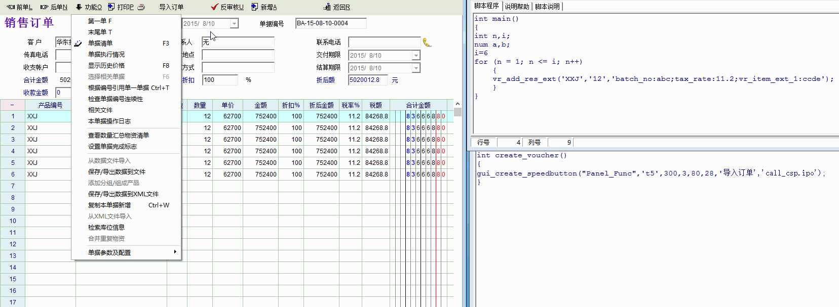 int main() { string fp,fn; int pos, len,a; fp=select_file_to_open('选择文件','Excel文档|*.xl*'); if(fp=='') {break;} fn = fp; for(a=1;a<strlen(fn);a++) { pos = str_pos(fn, "\"); len = strlen(fn); fn = str_get_sub(fn, pos + 1, len - pos - 1); } pos = str_pos(fn, "."); len = strlen(fn); fn = str_get_sub(fn, 0, len - pos + 1) int trow, i, n; string sql; xls_open_book(fp); xls_select_sheet_by_title(fn); db_select_area(1); xls_sheet_to_dbio(); i = db_row_count(); db_go_head(); for (n = 1; n <= i; n++) { vr_add_res_ext(db_res(0), db_res(1), 'batch_no:abc;tax_rate:11.2;vr_item_ext_1:ccde'); db_next() } } |