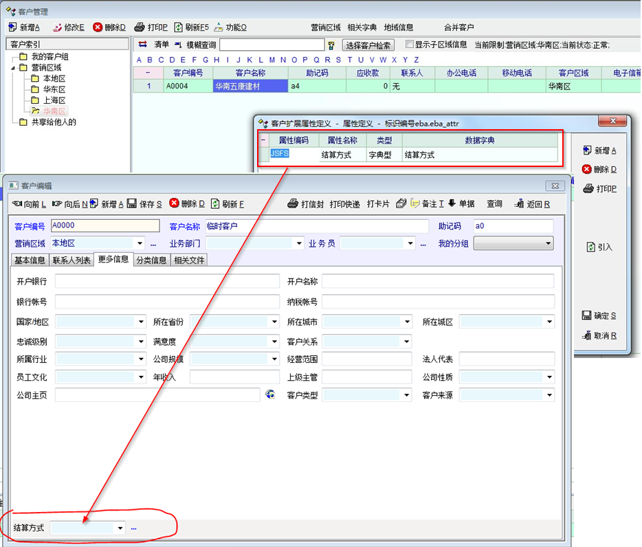 1、客户资料扩展一个属性结算方式属性,属性编码为"JSFS"。