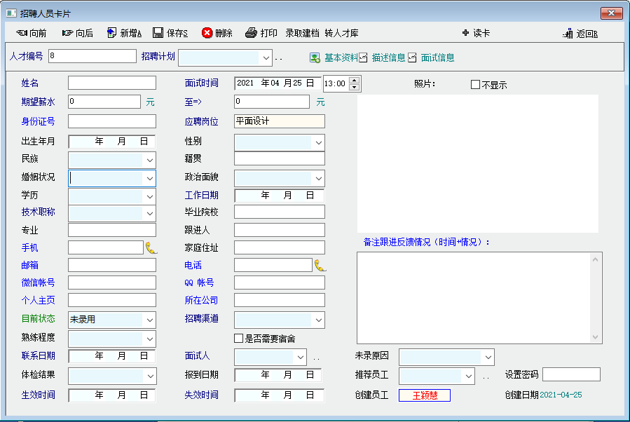 可以增加“招聘人才卡片”界面的自助界面调整,主要是跟踪公司实际状态调整需要的表格信息内容,将不需要的内容隐藏显示。