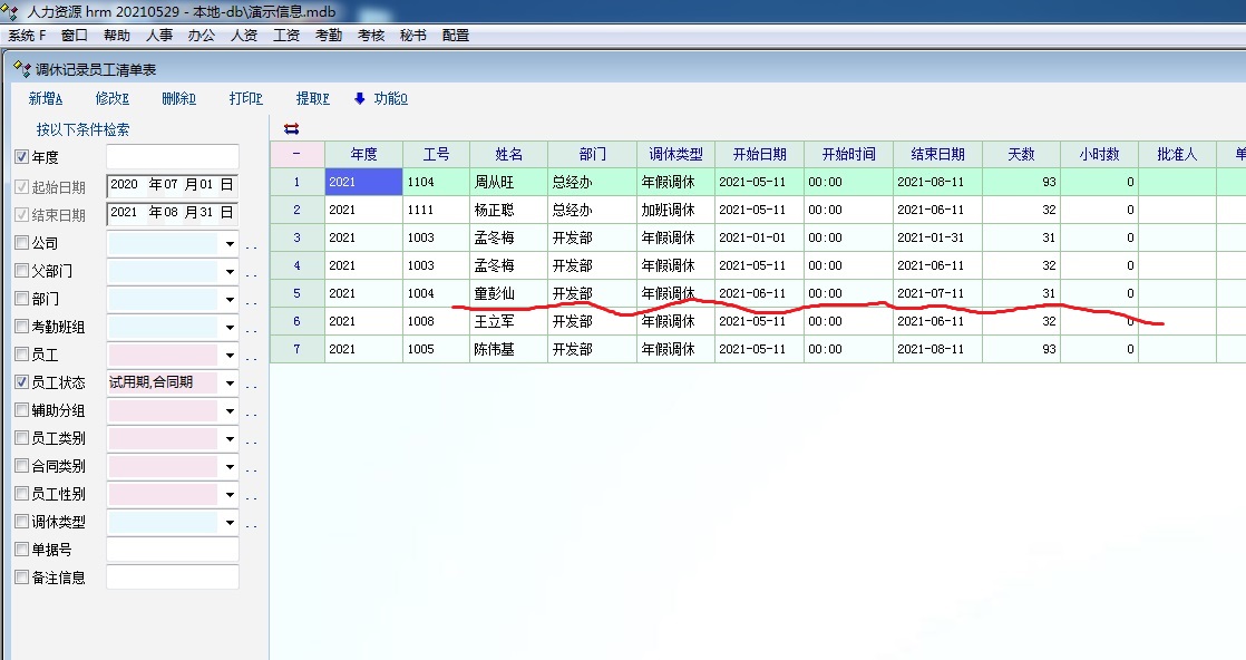 1,调休记录员工清单表,里面不能显示跨月份休假的人,例如我检索7.1-7.30休假的人,如果有6.25-7.15休假的人检索不出来