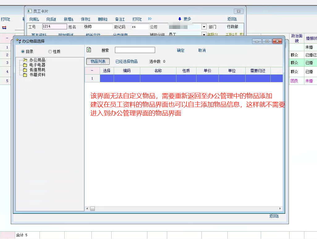 在员工资料----员工卡片-----物品-----增加记录-----类型选项中添加物品,如果该物品未添加,需要重新返回界面,在办公管理中增加物品,这样导致了在员工资料中无法自定义物品名称。