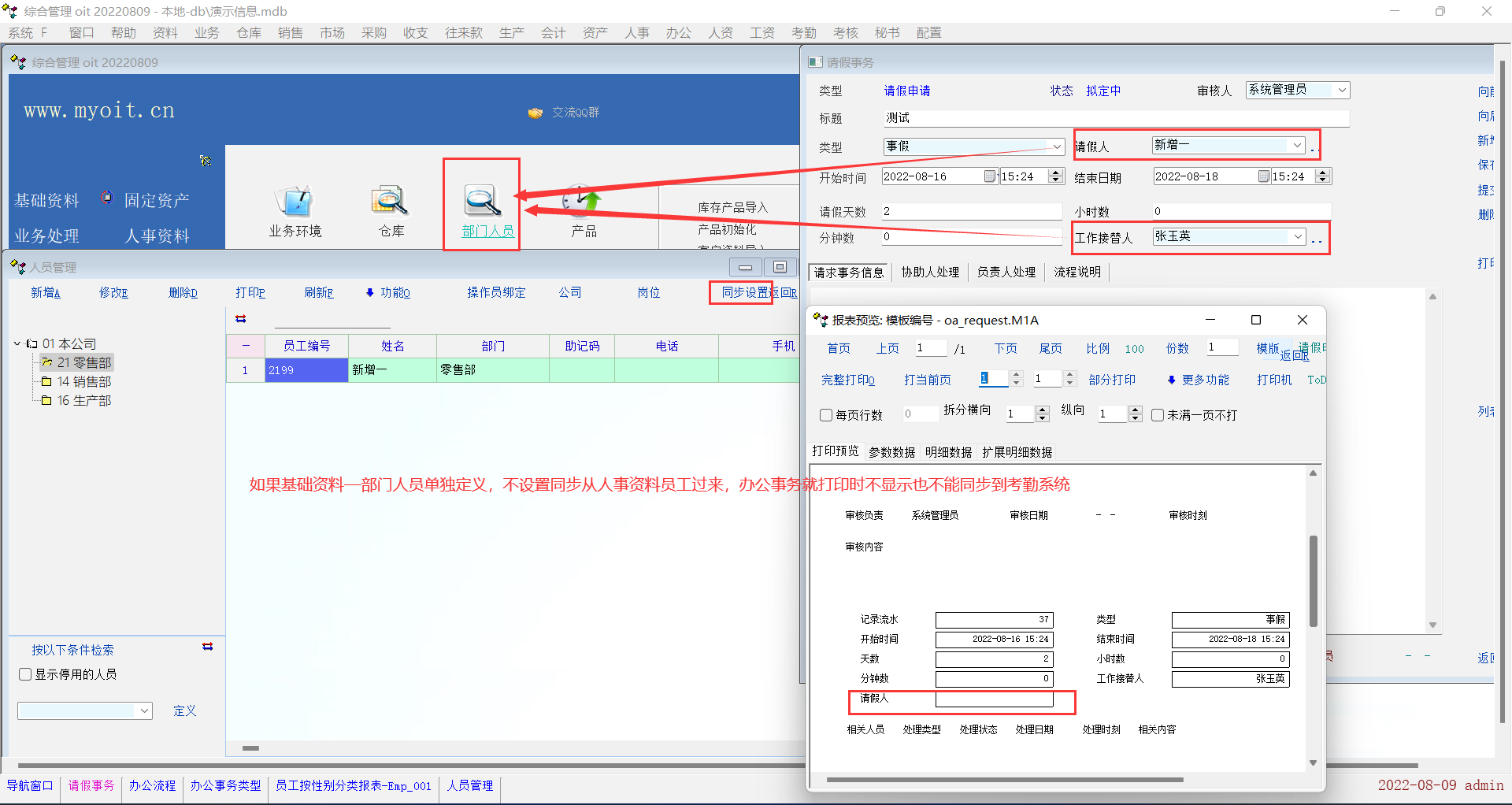 办公事务的人员现在取的是基础资料-部门人员,能否设置用人事资料的员工?现在我们基础资料-部门人员是单独定义,制单可以选择保存,打印时不显示,如果同步设置-从人事资料同步再选择这些人员就可以显示正常,基础资料-部门人员还是能单独定义要灵活点,办公事务可以同步到考勤系统应该直接取人事员工资料比较好吧?