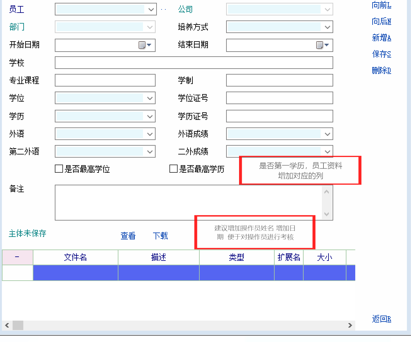 感谢新版本增加了创建人 和创建日期  信息  现在员工学历有很多 第一学历很重要的  希望老师能考虑把另外一个建议增加上!