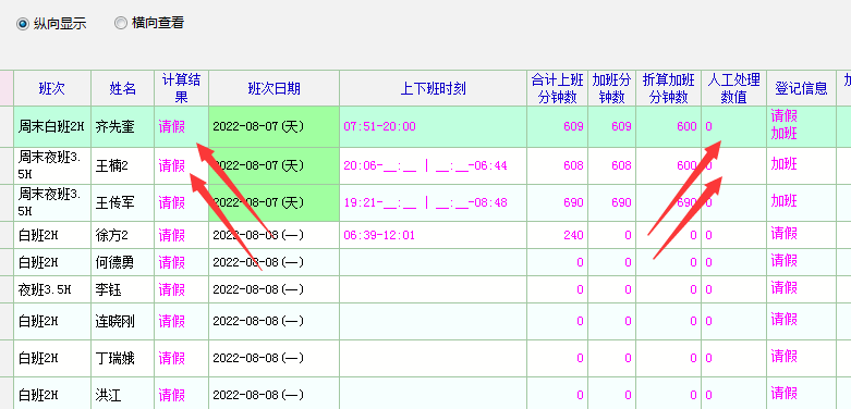 原创_考勤日帐里面,计算结果一旦是“请假”,不管是有加班迟到早退等数据,人工处理数值里_人力资产