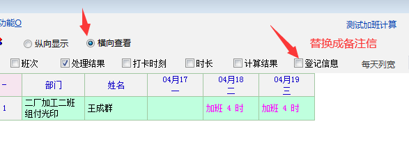 二,横向显示里面的登记信息替换成”备注“,因为计算结果与登记信息两个结果是一样的,只要一项就可以。备注里面显示请假类型------事假,病假等等,选择打勾,这样能够看到明确的请假类型