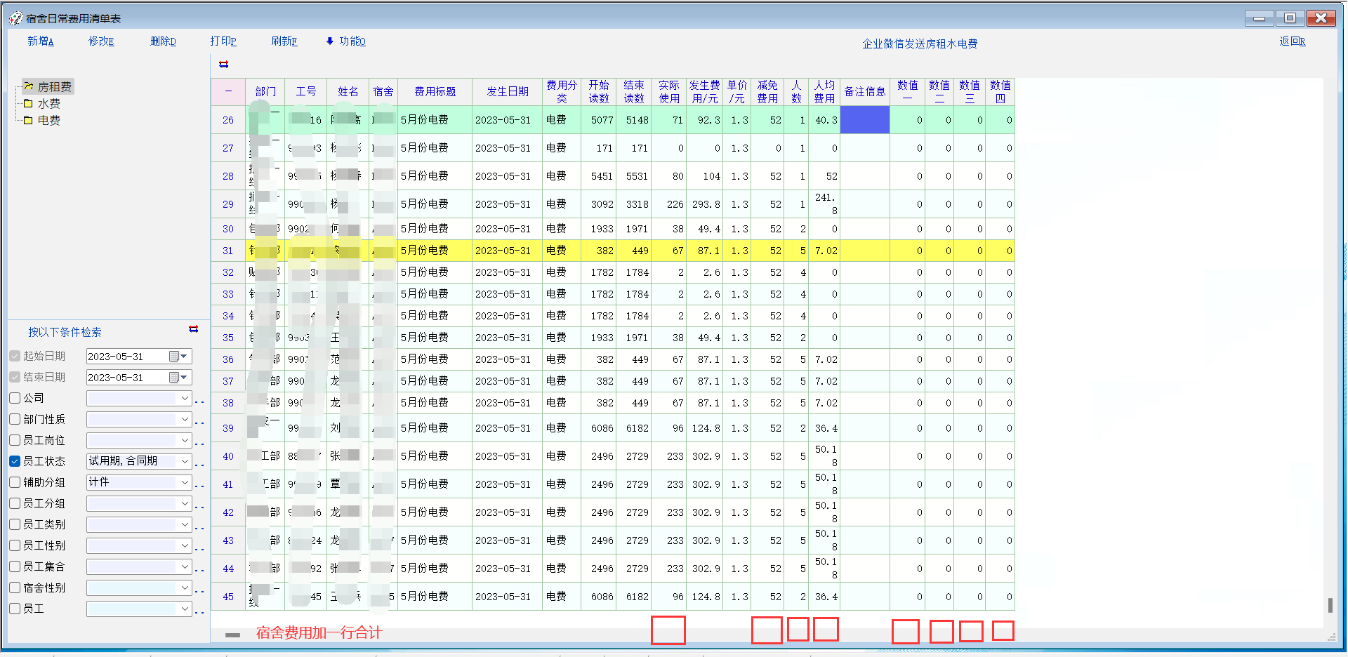 宿舍费用导入工资表后,因源宿舍费用报表没有合计,一般是复制到excel去汇总核对下合计数是否有差异,建议增加方便核对!