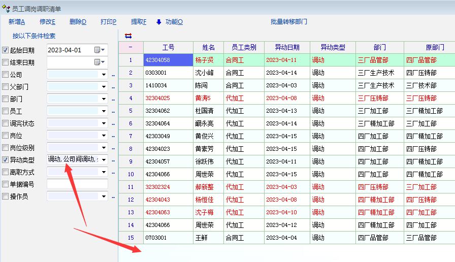 工资标准里面选择异动人员---这里面把离职的人员也显示出来了,最好直接显示部门或者岗位异动的人员(异动类型可以选择),或者异动的人员可以刷选。目前没有办法刷选