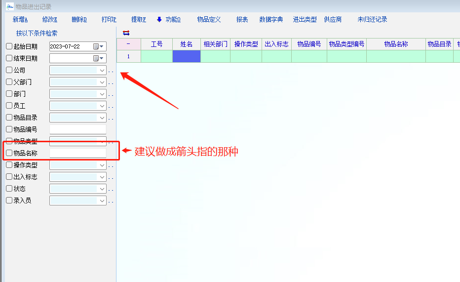 2:物品进出记录检索下的物品名称
