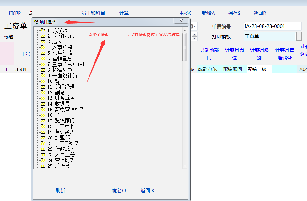 工资单里面----右键修改部门与岗位,不管是部门与岗位,显示的界面没有办法检索----------这样造成部门与岗位多的企业选择困难,所以最好添加检索项目