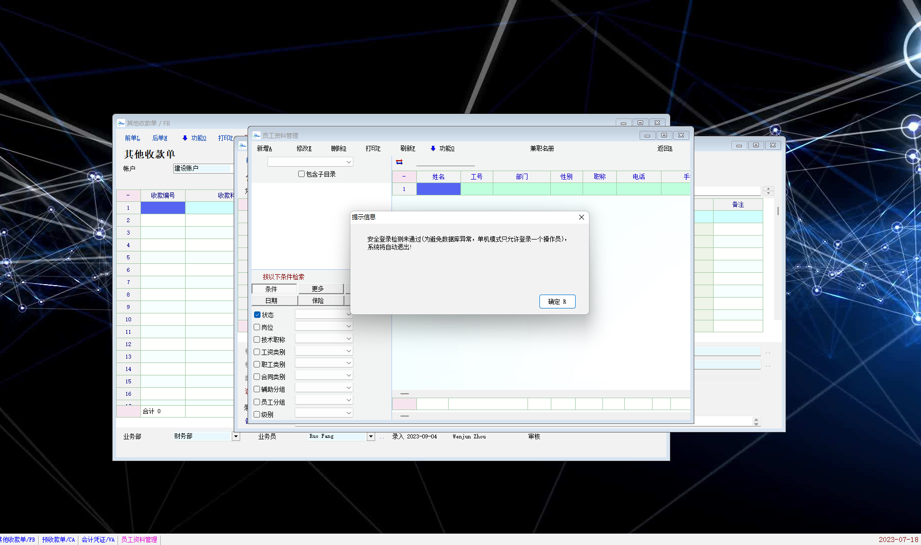 安全登录检测未通过(为避免数据库异常,单机模式只允许登录一个操作员),系统将自动退出!