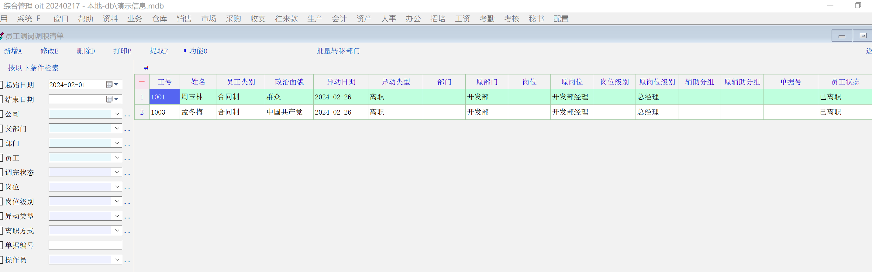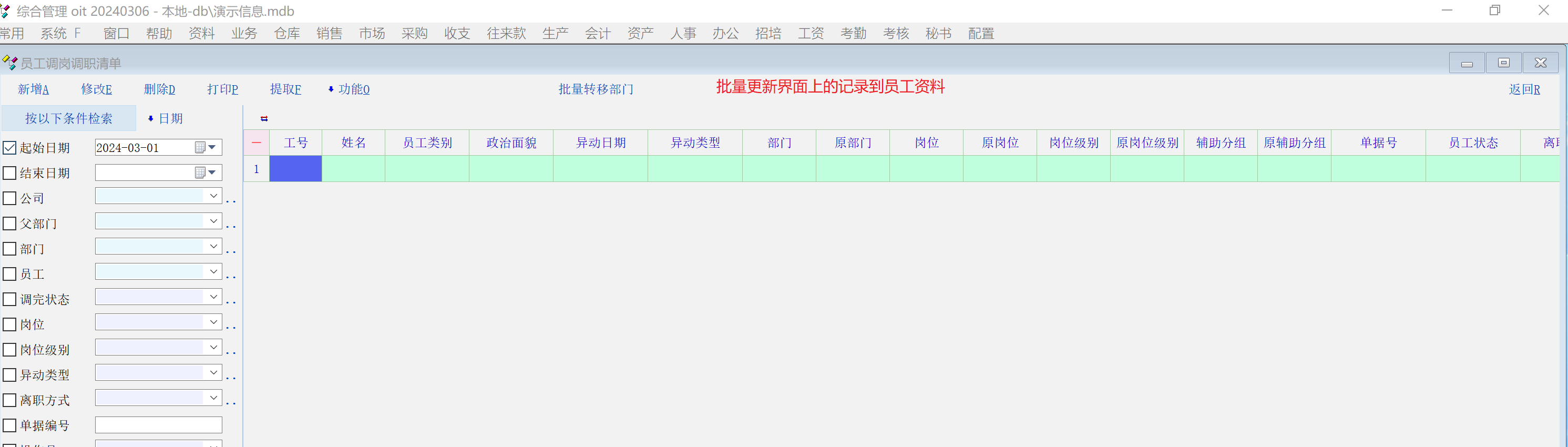 实际工作中:有时候为了方便工资计算的需要 有些调岗调职的记录不需要实时更新员工资料,但是记录很多的时候 再次一个一个的更新又影响工作效率,建议在功能下新增批量更新调岗调职记录的菜单!