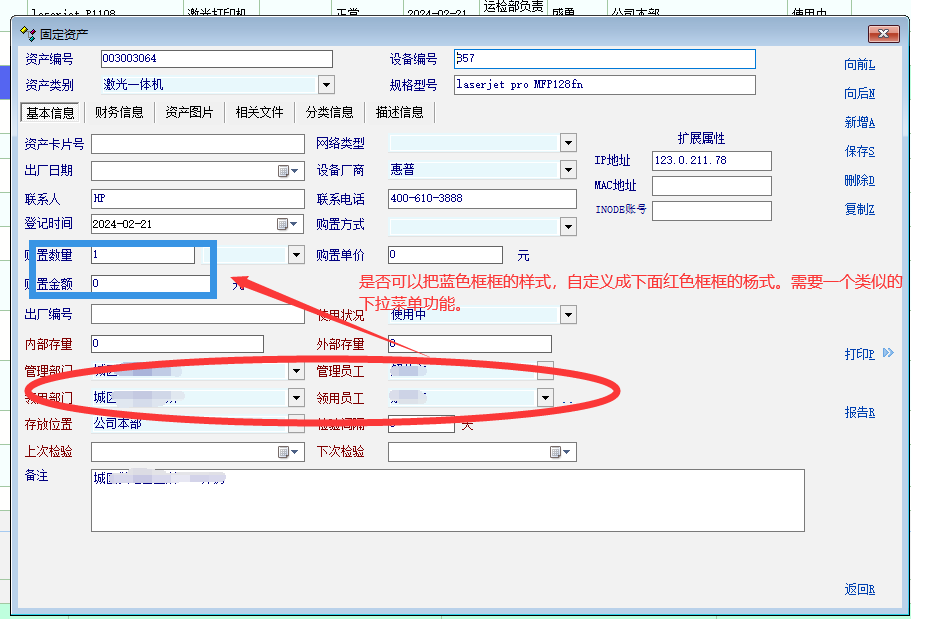 求助_资产模块中的固定资产卡片中的部分信息能否修改成下拉菜单?_人力资产