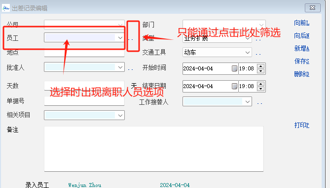 而在新增记录员工字段里下拉选择员工时出现离职员工的选项