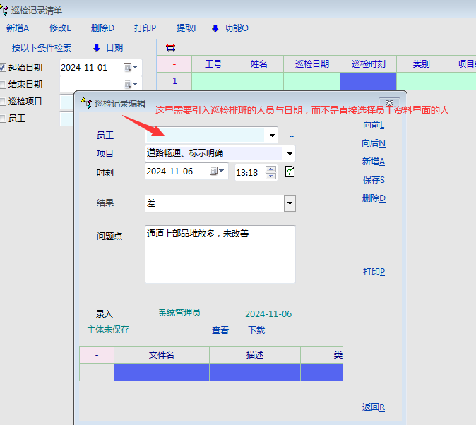 3、排班与巡检记录需要关联:最好是----每一条排班记录下面添加巡检记录---而不是去添加巡检记录的时候,重新再次选择员工去记录,这样容易选择错误----排班失去了意义