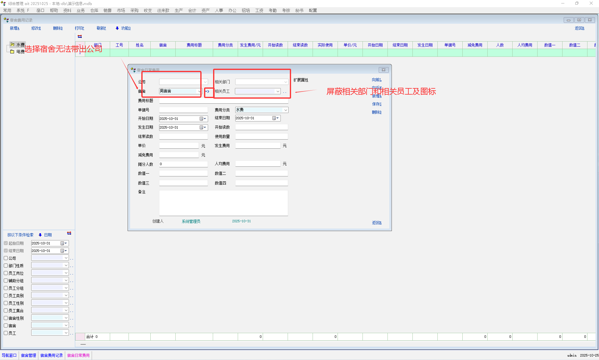 1:宿舍费用在宿舍费用分摊清单中既然以宿舍为单位均摊水电(指不选择相应员工)而不是以入住员工为单位分摊水电,建议删除宿舍日常费用的相关部门,相关员工字段及 SpeedButton_Dorm_Emp  图标