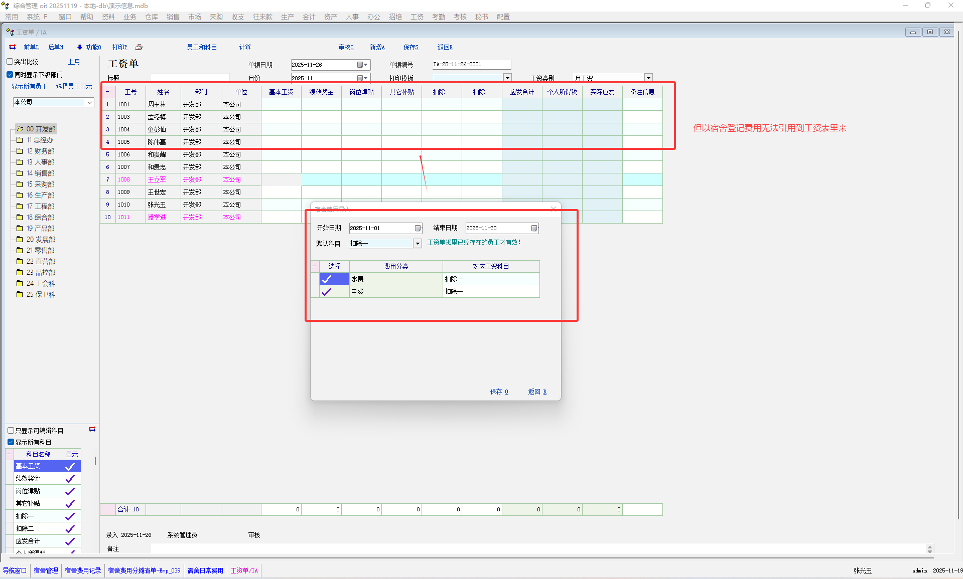 2:以宿舍号登记费用,分摊报表正常,但无法引用到工资表里的宿舍费用中