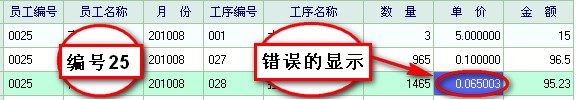 问题是工价是在工序定额中拟定好的,按照你的计算方式做同一道工序显示出来的工价就不一样了,虽然工资相差不多,但打印报表看起来却不爽了。编程时应该是工价乘以数量,而不是以工资除出数量,没有工价哪来工资,所以说还是工价显示有问题。(上面的图片是同一道工序,定价为0.065,只是不同编号的员工操作,显示出来的工价却不相同)