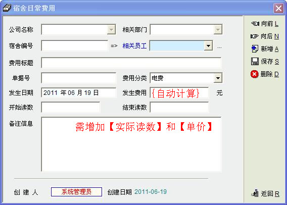 在人力资源系统中的办公管理模块下《宿舍管理》中,希望能增加水电费用单价栏位,同时希望能自动计算实际用水、电数,《发生费用》希望是自动计算生成,谢谢!