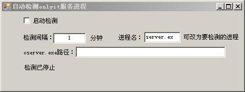 针对网络版的后台服务程序有时候计算量大或因其它原因自动退出,导致客户端无法登陆的情况。自制了个进程检测工具,一旦没有onlyit服务进程,自动启动服务。
