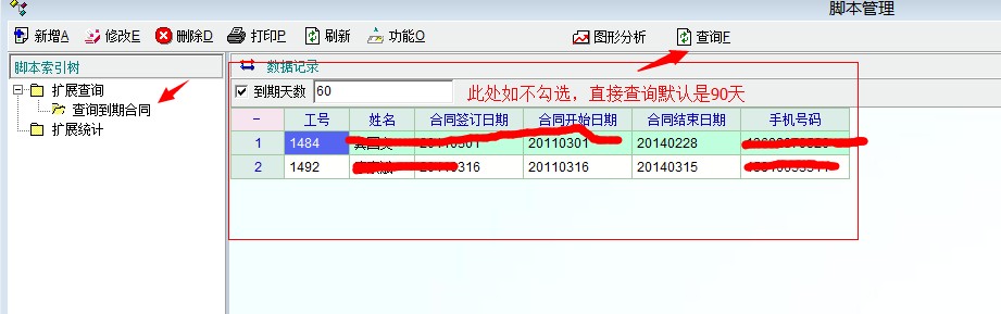 1、打开配置管理,点数据脚本。点左手边,扩展查询,右键增加一个,脚本名称随便填,如提取到期合同。 2、在下面的脚本定义框中输入如下脚本 int func_def_lmt() { def_lmt_str("ddate","到期天数"); return 1; }; int func_def_field() { db_set_field_count(6); db_set_field_info(0,'emp_id',"工号",60); db_set_field_info(1,'name',"姓名",60); db_set_field_info(2,'sign_date',"合同签订日期",100); db_set_field_info(3,'beg_date',"合同开始日期",100); db_set_field_info(4,'end_date',"合同结束日期",100); db_set_field_info(5,'mobile',"手机号码",100); return 1; }; int func_def_imp() { return 1; }; int func_init() { return 1; }; int func_query() { if(lmt_checked("ddate")) { //msg(lmt_val("ddate")) } else { def_lmt_set_val("ddate","90"); } string 到期日 到期日=date_add(get_cur_date_std(),lmt_val("ddate")) string sql; sql="select a.emp_id,b.[name],a.sign_date,a.beg_date,a.end_date,b.mobile from emp_contract a,emp b" sql=sql+" where a.emp_id=b.emp_id and end_date between '"+get_cur_date_std()+"' and '"+到期日+"' and b.state!='F'" db_run(sql); return 1; }; 保存即可 退出后就可以看到扩展查询下面多了个提取到期合同的项,单击,再点查询 |