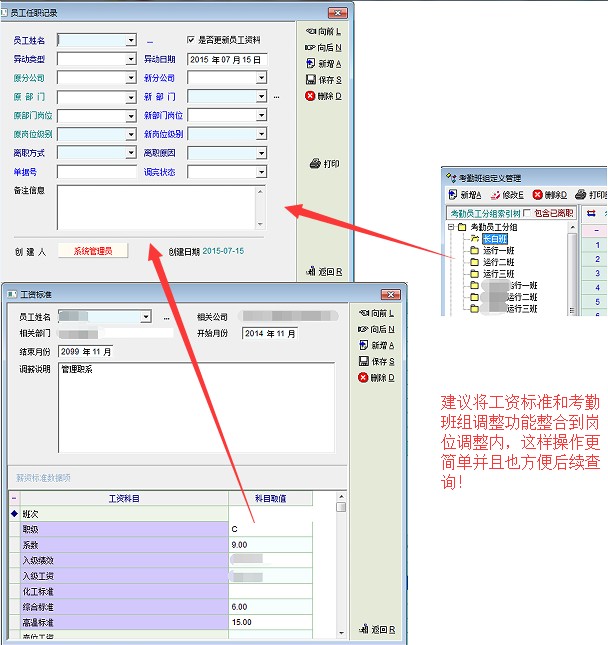 老师,遵循岗动薪动原则,员工在调岗时就可能涉及到岗位、薪酬及班次的调整,而目前是分别在三个模块里调整的相对来说比较麻烦,如果能在岗位调整里增加这两个内容就方便了,虽然岗位可以按岗位等级划分,但每个岗位所对应的职级是活动的,如员工在F1-F10的职等范围内,同一个岗位员工的等级也就会有不同,所以建议整合。
