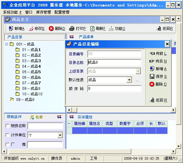 商品定义时,成品8它应该在“成品”目录下,现在跑到跟目录下(截图1)。在没有对(截图1)的目录进行任何改变的情况下入库,在“选择物品”时,“成品8”归位了,但“成品1”又跑到跟目录了。(截图2)