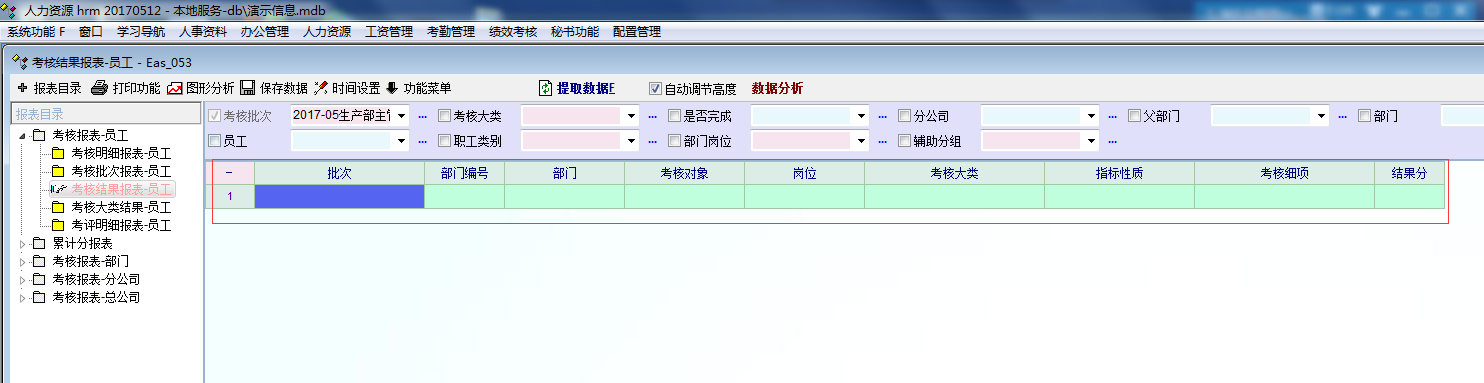 考核报表里的(考核结果报表-结果)与(员工考核)考核内容细项同步,尾部合计结果值