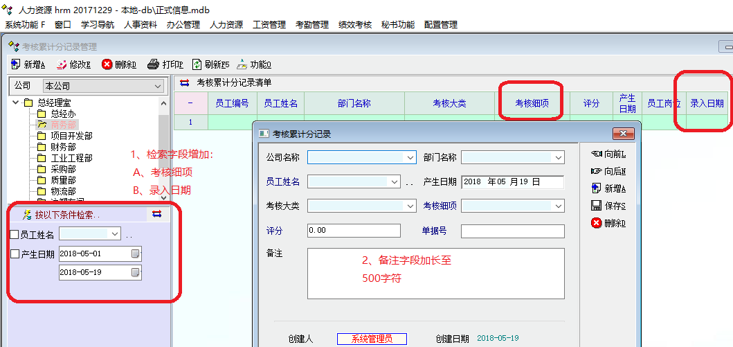 2、增加检索字段:A.考核细项   B.录入日期