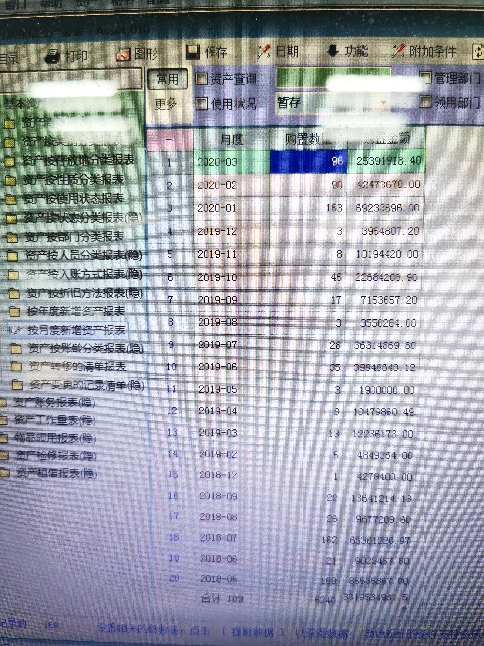 1.资产报表里面的“按月度新增资产报表”在点击其中一个项目时弹出的不是对应的设备资料而是所有的设备条目都出来了。