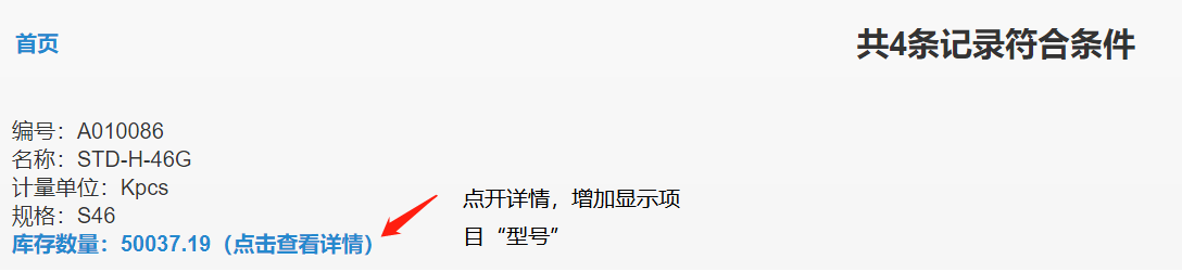 @孟老师,@王老师,1,手机界面在库存查询时,点击”查看详情“中能否添加显示"型号"?这个很实用。