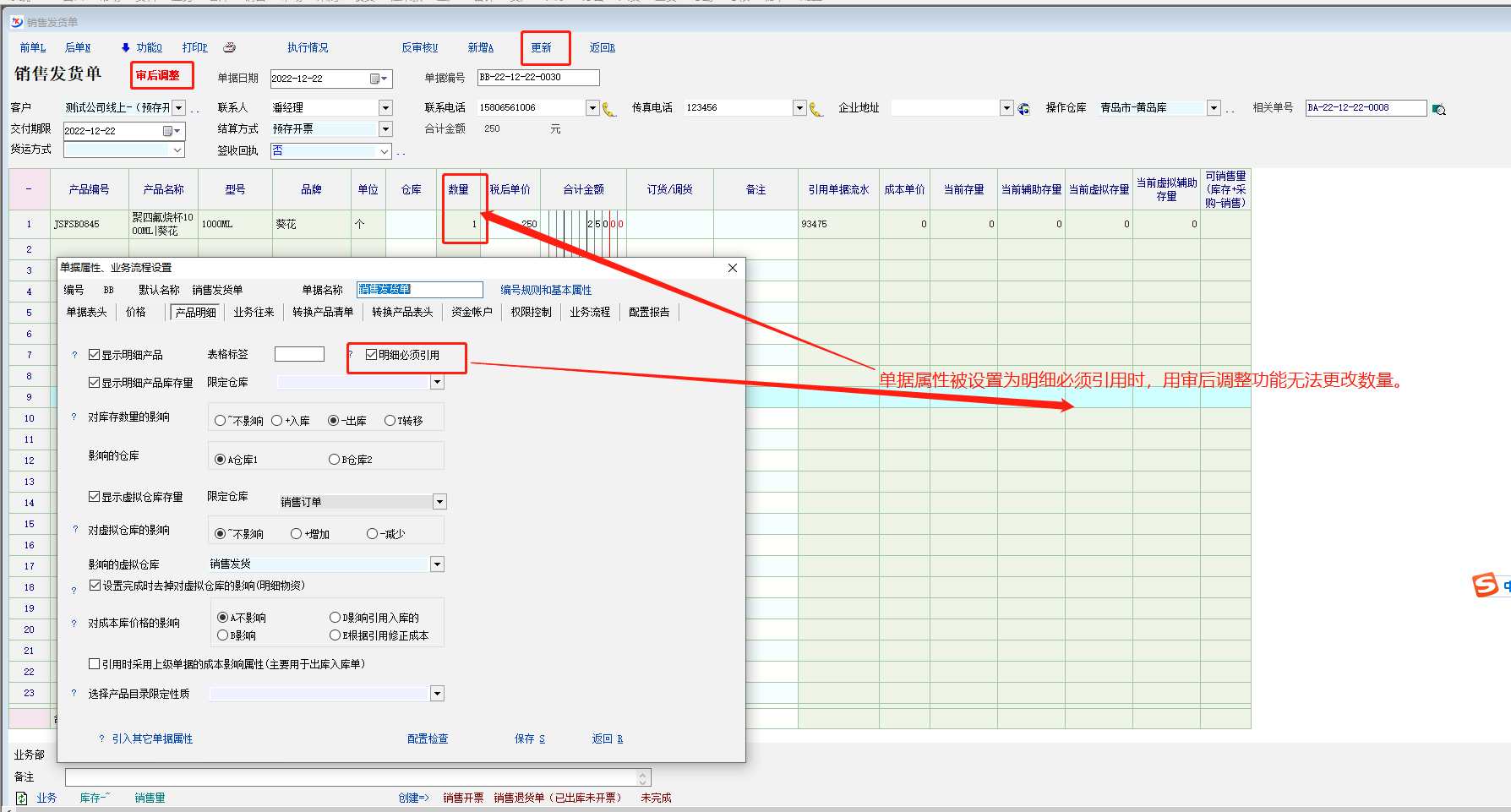 求助:销售发货单被设置为必须引用明细时,用审后调整无法修改数量的问题。详细见图。