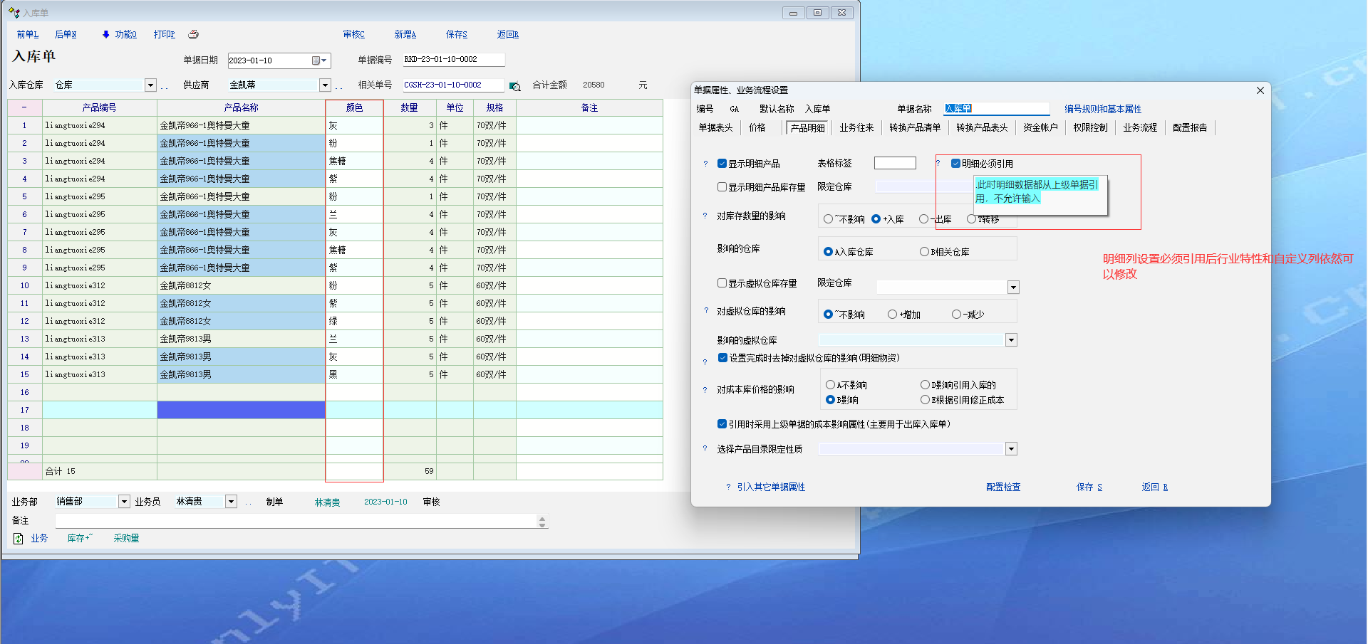 选择明细必须引用后产品特性属性列依然可以修改, 还发现索引中的一个问题就是单据索引后表头供应商或者客户可以改变,比如张三的单据索引过来后把表头张三改成李四后单据会保存为李四,但是张三的索引信息依然改变了. 可不可以让表头信息跟产品明细都必须索引不能修改, |