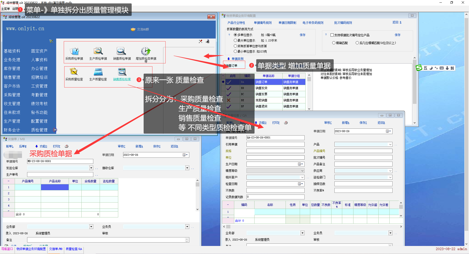 质检模块 可以单独拆分出来嘛?做为独立模块,放在生产模块感觉不太合适。 拆分后 质检类单据能再增加 几张普通单据,因为有客户简化用就 采购订单-》采购质检单(直接用普通单据 ,只是质检部多个流程) -》采购入库。