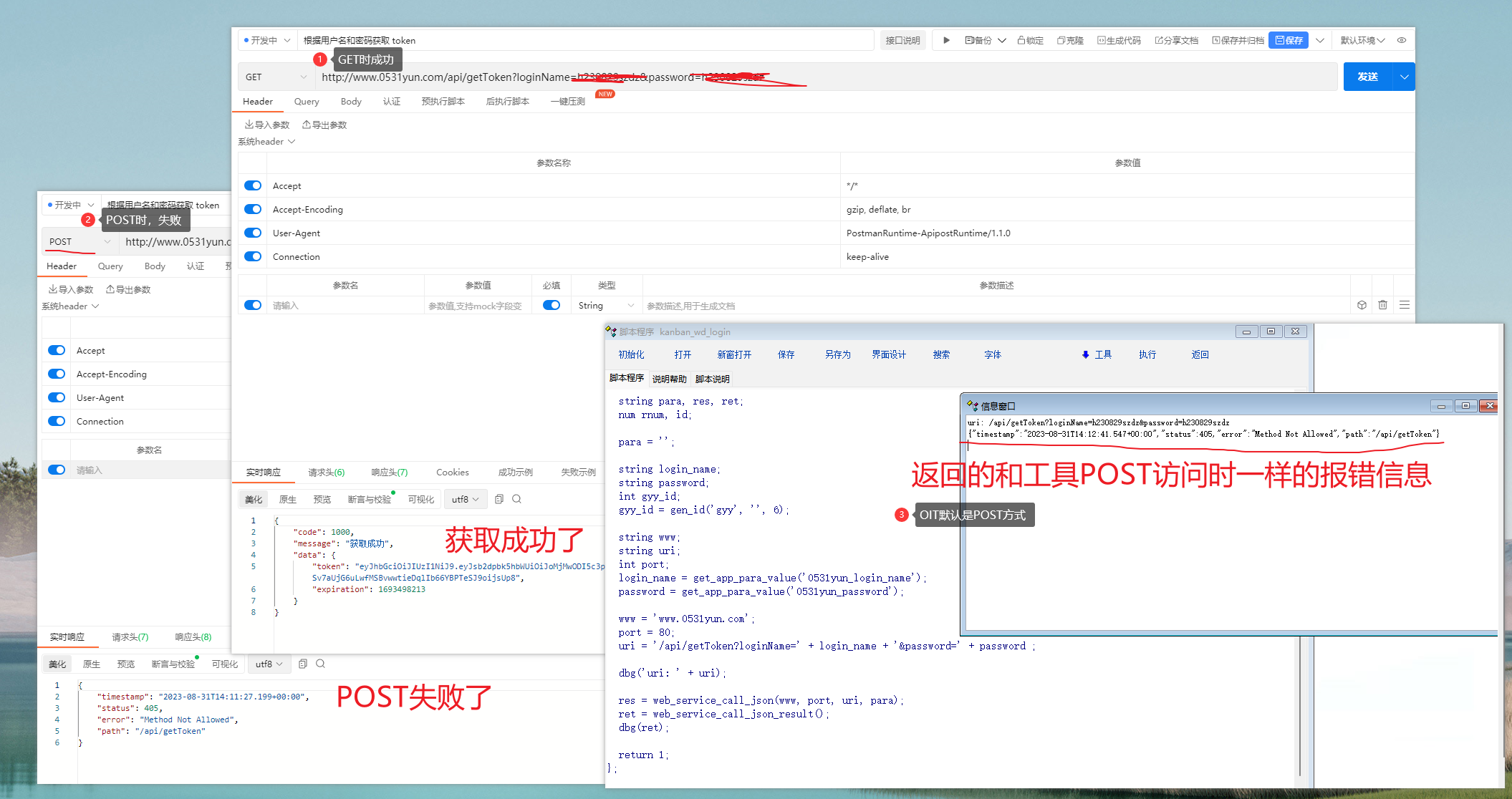 而使用oit访问时,和工具post返回的错误是一样的。