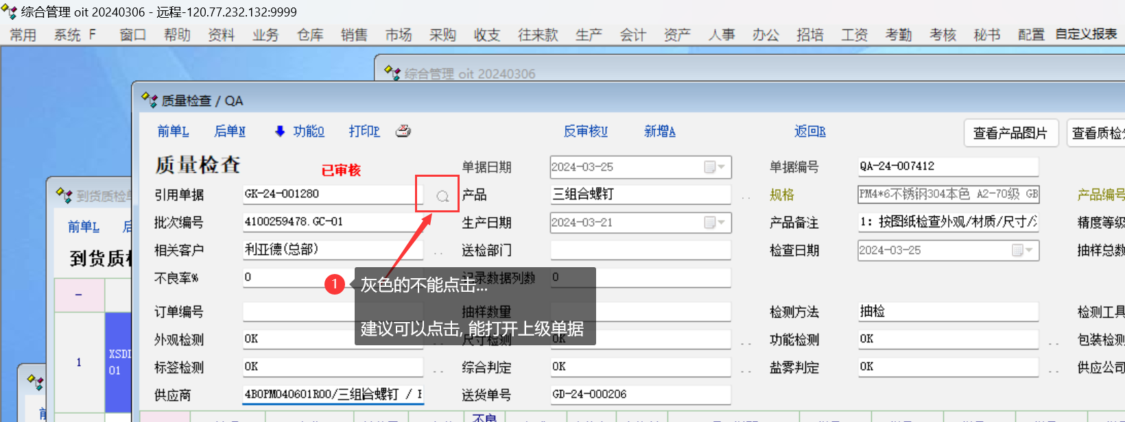 目前, 质检检查单据, 审核之后, 按钮 不能再点击, 打开上级单据了. 建议可以点击打开上级单据, 详细看图. |