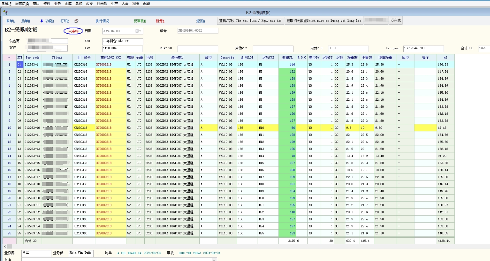 我们目前是提前录入客户提供的布料进口表,一个布种和颜色录入一个主料进口表单据,里面包含款号,布种,颜色,部位,缸号,总疋数,总码数等信息,打印出来作为来料验收清点的凭证,然后在把客户提供的详细缸号疋号信息导入到采购收货单据,打印物料标签出来,在卸货分缸的时候贴标签并核对原始标签上的布种,颜色,缸号,疋号,等信息是否无误