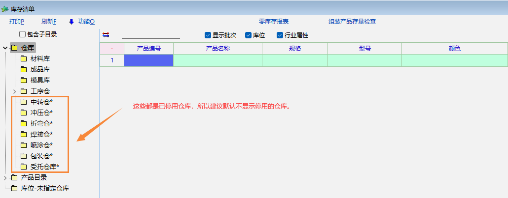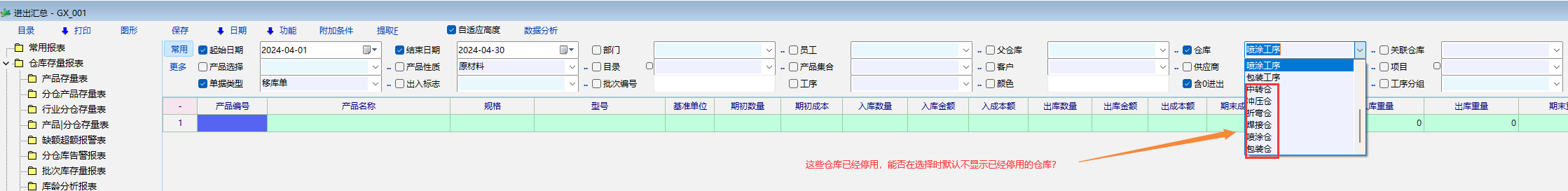 在查询相关报表时,有些仓库已经停用,但是仍然会显示在仓库列表中(有时候库存清单列表也会有,只是带一个*号),能否默认不显示已停用仓库?