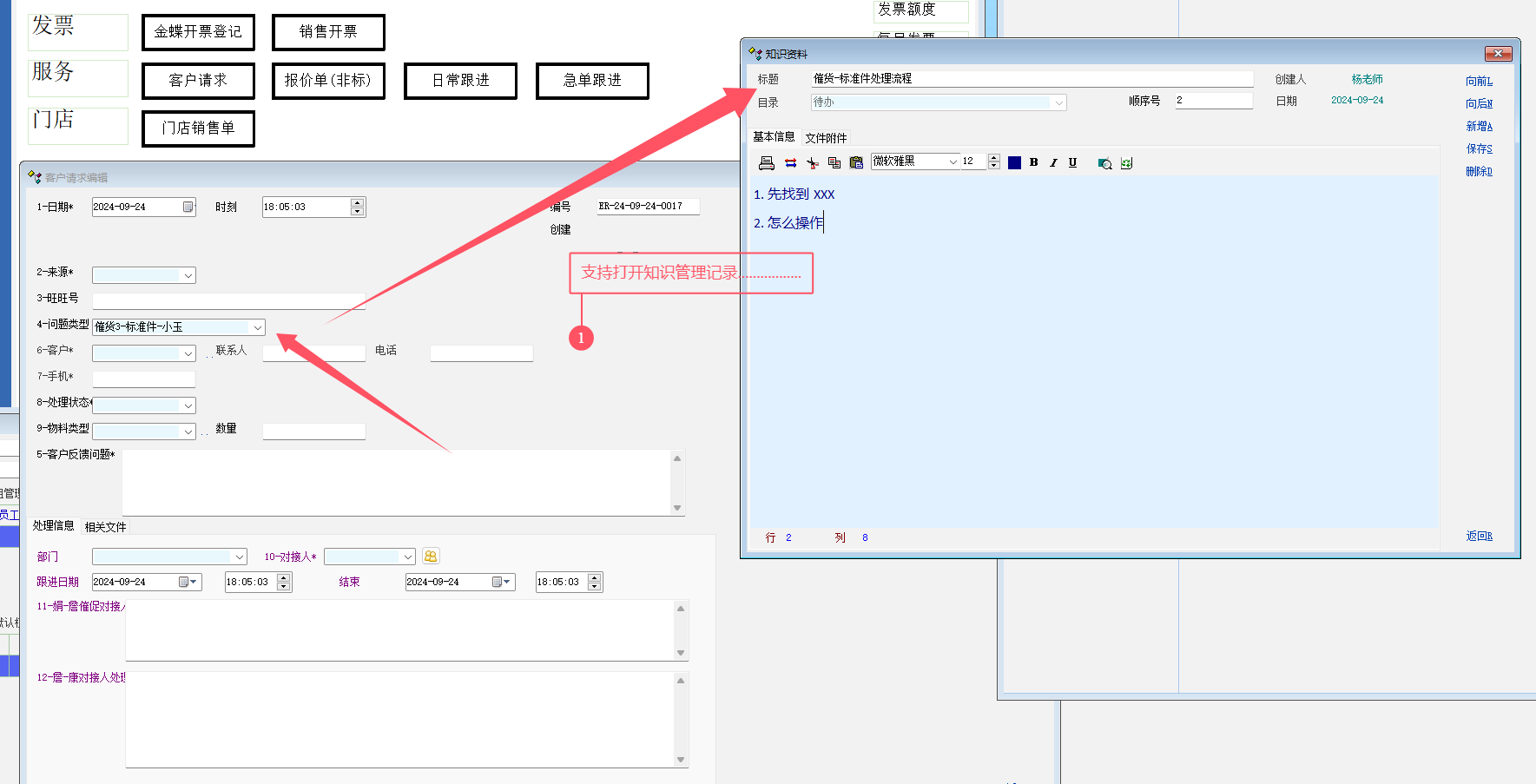 应用场景: 一些 操作流程的标准, 某个帮助. 某些经验分享. 可以使用系统的知识管理记录下来. 然后在某个需要展示时, 使用脚本调用 打开知识卡片记录. 例如: 客户提出来, 想针对售后, 客户请求中, 某些类型, 记录一些解决方案. 这时候在客户请求上添加一个按钮 , 能打开 对应的知识记录就方便了. |