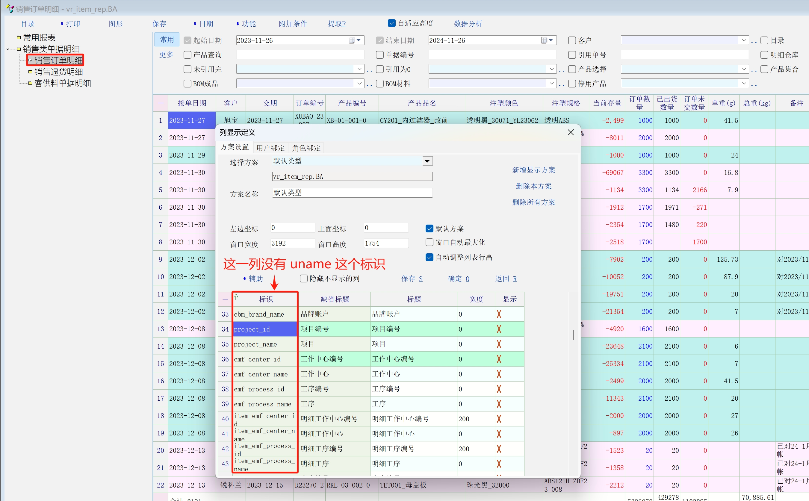 如题,产品定义中的 uname别名 在销售报表》》销售订单明细中找不到