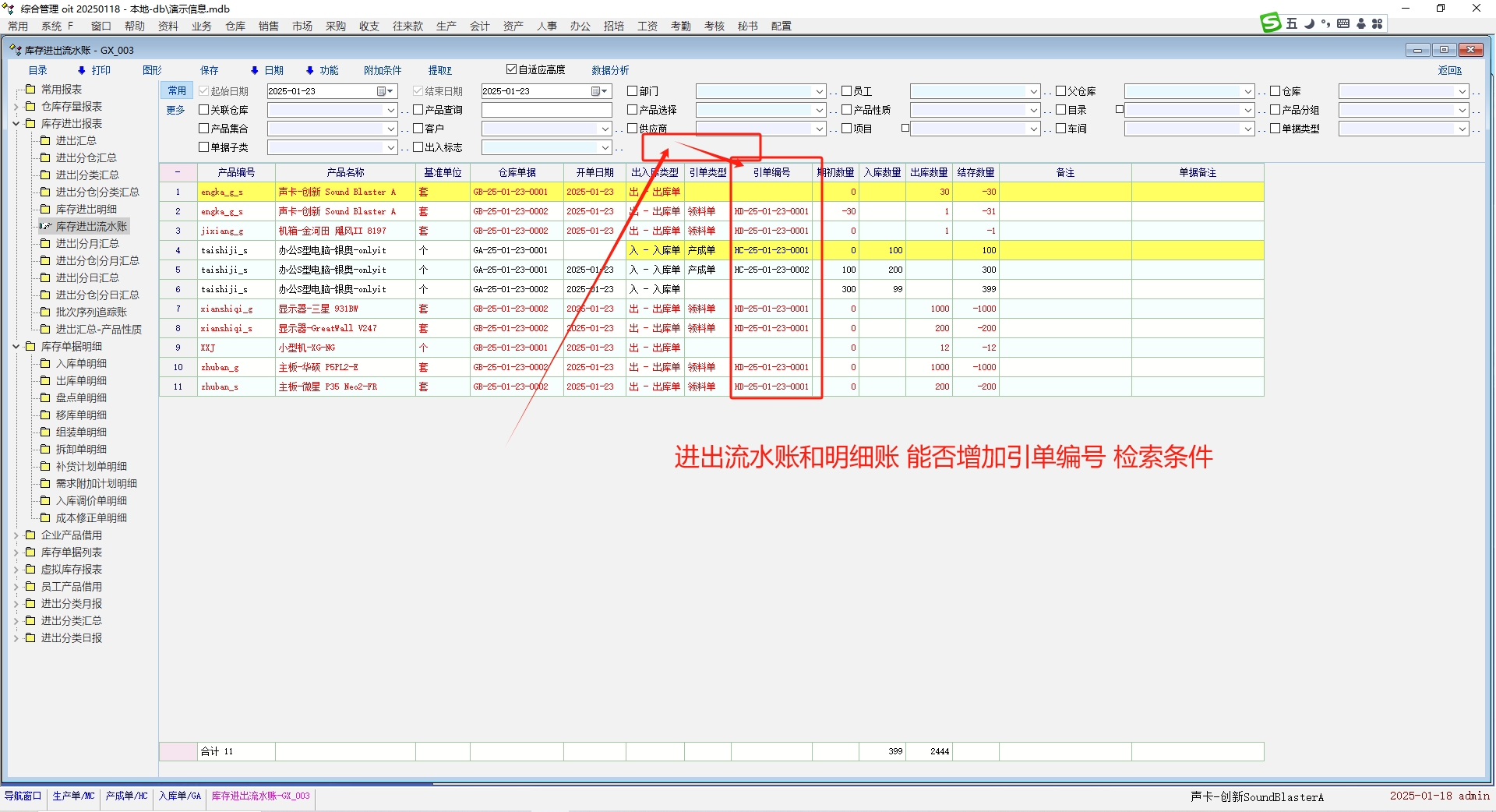 库存进出流水账和明细账 增加 引单编号 检索条件。