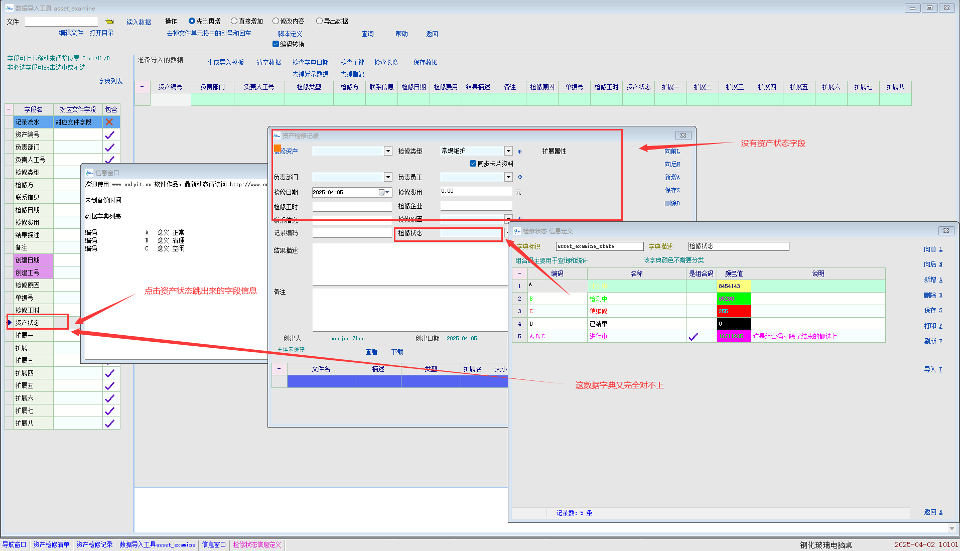 1:检修卡片增加的是检修状态,导入页面增加的是资产状态,由于字段不一样导致无法导入