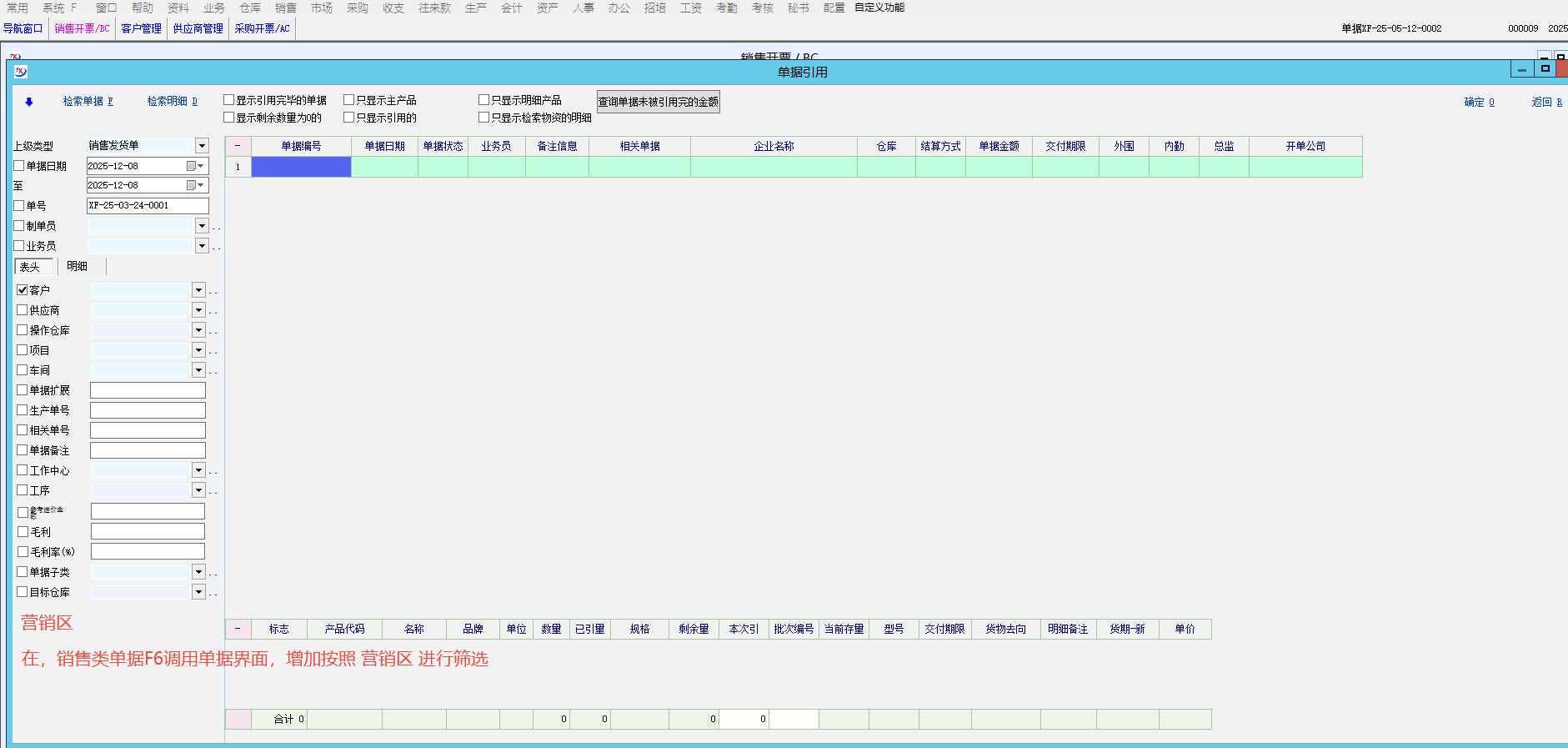 在销售类单据F6调用单据界面,增加按照 “营销区 ”进行筛选