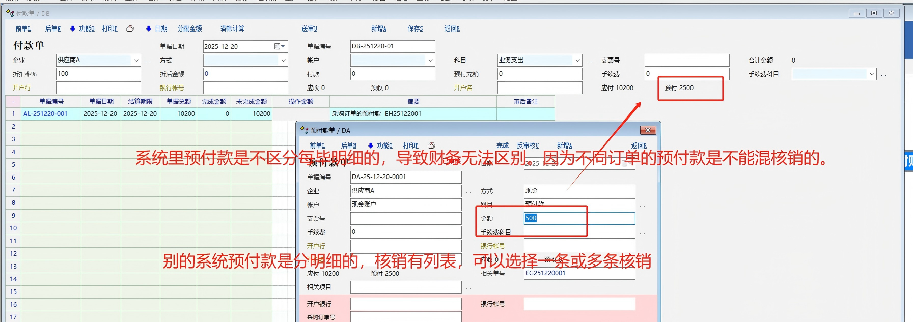 这个问题用户财务部实际都有提过。财务用预付款核销时可以选择一个预付记录也可以选择多个预付记录,这个看公司实际情况。严格就一个预付款对一个订单就选择一个预付款剩下应付款用实付。 销售里预收款也有这情况,客户预收款一单对一单也不能混核销。