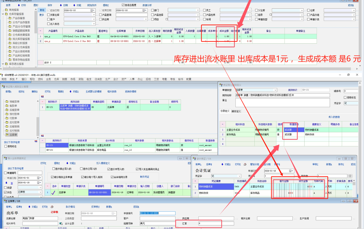库存进出流水账里 出库成本是1元,生成成本额 是6 元