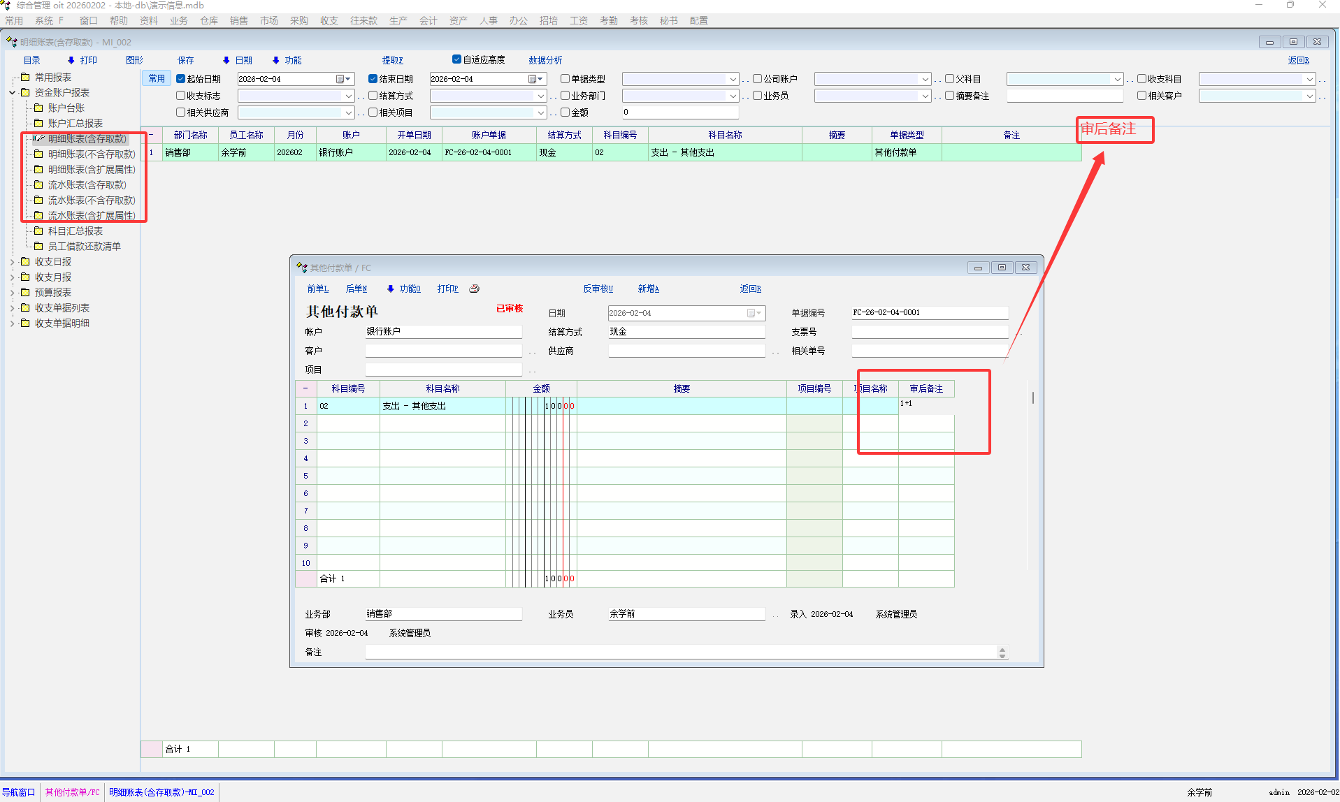 建议将其它收付款,往来账单据审后备注同步到明细账目,现金报表中的流水账表MI008,009,011,明细账表MI002,004,007,