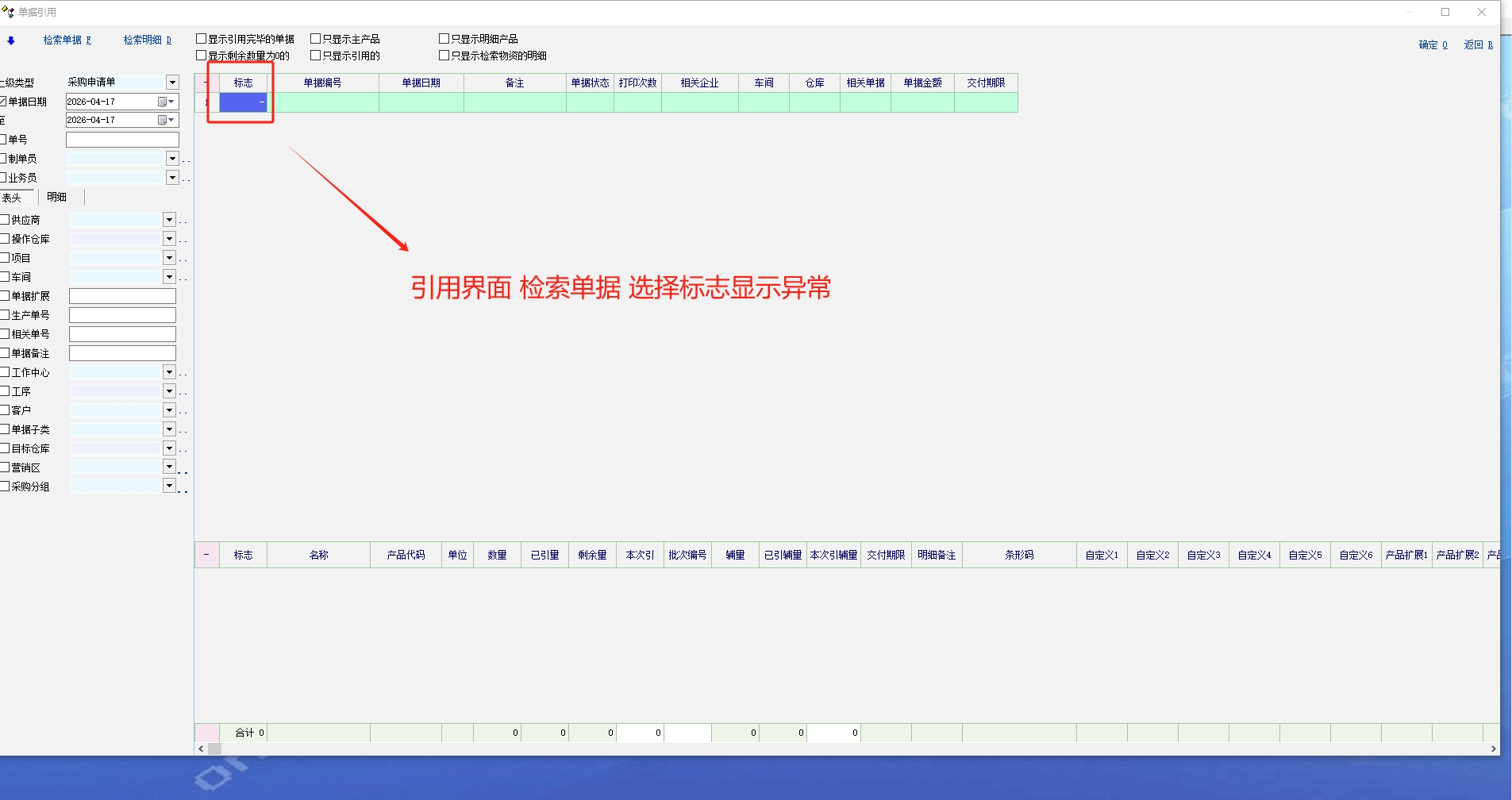 引用界面 检索单据 选择标识  显示异常