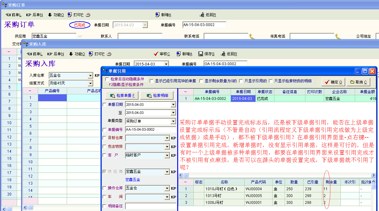 请教一个问题,设置单据引用流程定义:上级单据 采购订单   下级单据库存管理 入库单  ,因为有的供应商送货时没完全按数量或点错送货少1.2个是正常的事,这样我们就算这订单已经完成了,所以入库单 就没有引用完采购订单的数量,未引用剩余1.2个,这张单系统就没有自动设置完成标志,操作员手动设置单据完成标示后,在做入库单时,选择相关单据还会显示出这张订单来,有比较多这样的订单,容易造成混乱,如何设置这样手动设置单据完成标示后的订单也不再显示在相关单据引用里呢?