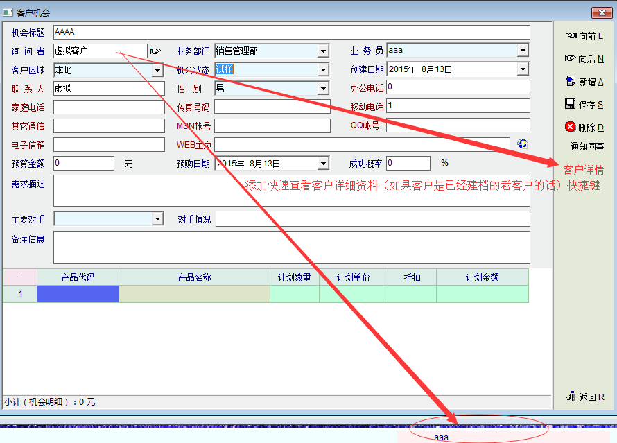 7、在客户机会中,没有可以快速查看客户的详细资料的方法(如果客户是已经建档的老客户的话),如果查看当前老客户的详细资料,必须切换到导航界面,打开客户管理,再选择当前客户后才能查看相关详情,太复杂,效率也太低。建议添加快速查看老客户详细资料的快捷方法(右下角快速打开)或快捷键。