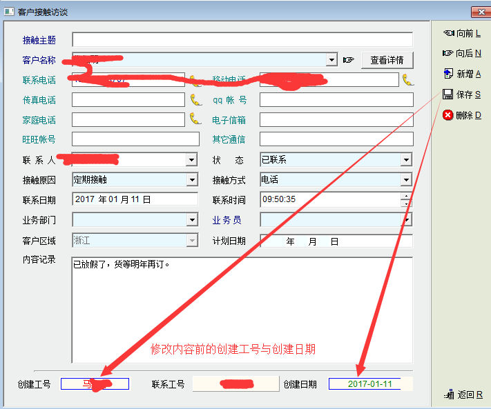 讨论_客户接触记录中修改内容保存后重新打开,创建工号与创建日期会发生更改_产供销